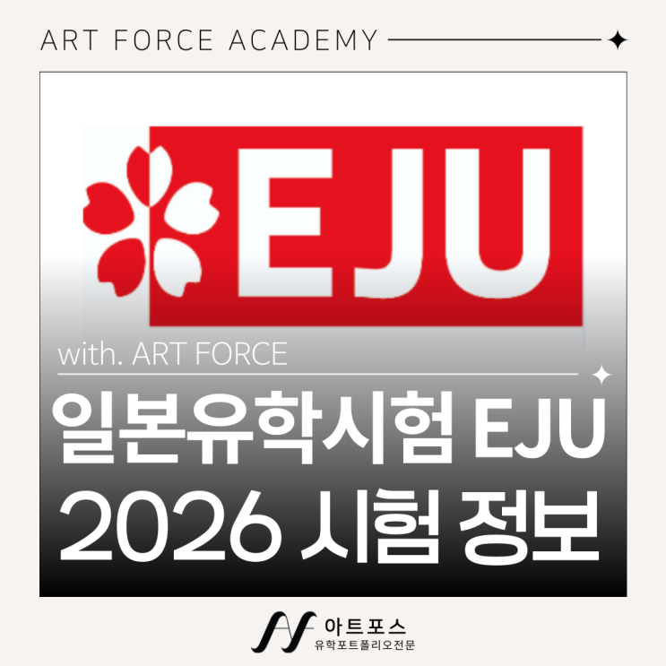 안녕하세요~ 일본 애니메이션/만화 유학원 아트포스입니다 :) 오늘은 일본유학시험 EJU의 2026년도 제1회 시험 정보를 전해 드리려고 합니다! EJU란? 일본학생지원기구(JASSO)에서 실시하는, 일본의 대학 등에 입학을 희망하는 외국인 유학생의 일본어 능력 및 기초 학력을 평가하는 시험입니다. 종류는 일본어과목, 이과, 종합과목, 수학 4가지가 있으며 대학의 계열에 따라 요구하는 시험 종류가 달라집니다. 미대의 경우 일본어과목 성적만 필요로 합니다. 2026년도 제1회 일본유학시험 EJU 시험 정보 시험일 2026년 6월 21일(일) 접수기간 2026년 2월 16일(월) ~ 3월 12일(목) 오후 5시 접수방법 마이페이지 가입 후 신청 자세한 내용은 홈페....... <img src="https://blogthumb.pstatic.net/MjAyNjAyMjhfMTUy/MDAxNzcyMjcxNjkzMDEx.EskIKP-nI6fqPAPPbhMrGSUH_giE_wt3GZldGX8s-vgg.FE_s13cyypPV2wvw_IViNEiqzSdJ16UviqvSc_G_e8og.PNG/2026-%C1%A61%C8%B8-EJU-%BD%C3%C7%E8-%C1%A4%BA%B8-001.png?type=s3" />