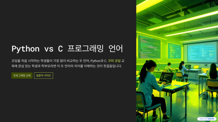 [신고번호 제2377호] Python과 C언어 차이 코딩을 처음 배울 때 어떤 언어가 좋을까? 코딩을 처음 배우려는 학생들이 자주 하는 질문 중 하나가 있습니다. “Python이 좋을까요? C언어가 좋을까요?” 프로그래밍을 시작할 때 많이 비교되는 언어가 바로 Python과 C언어입니다. 특히 구미 코딩 교육을 알아보는 학생이나 학부모들도 이 두 언어의 차이에 대해 궁금해하는 경우가 많습니다. 오늘은 Python과 C언어의 차이점을 쉽게 정리해 보겠습니다. Python이란 무엇일까? Python은 비교적 배우기 쉬운 프로그래밍 언어로 알려져 있습니다. 문법이 간단하고 코드가 읽기 쉽기 때문에 코딩을 처음 배우는 학생들이 많이 사용하는 언어입니다. 예를....... <img src="https://blogthumb.pstatic.net/MjAyNjAzMDhfMTg2/MDAxNzcyOTQzODMzMjk0.mxXp-Leii5odGEU5RZ61qj7EjZBbXsL6ZWU_Yynmbsog.yp2cgzzhFetg1QVDBt_D0JnPdxZApgkrCuvwpnyowYUg.PNG/1_Python-vs-C.png?type=s3" />
