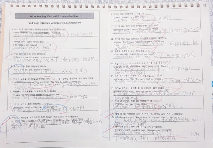 초3 봄부터 시작한 Reading Vocabulary Grammar 시리즈!! 그냥 막연히 레벨을 정한게 아니라 교재 한 권 끝날때 마다 레벨 테스트를 하며 한땀 한땀 쌓인 실력이 되었습니다. 꾸준히 실력이 쌓이니 벌써 200시리즈까지 오게 되었고 학습지를 Words Dictation Organizing Translation Grammar Unscramble를 병행하며 진행하니 완전학습이 안될 수가 없습니다! 현재 학습중인 Bricks Reading 200-2권 학습지 소개합니다. 다양한 work sheets로 완전학습 합니다! 그동한 학습한 교재를 모아보니 O진이가 다음에 학습할 교재가 궁금해집니다. O진아 레벨테스트 전에 열심히 완성하자!! <img src="https://blogthumb.pstatic.net/MjAyNjAyMTBfMTEw/MDAxNzcwNzMzNTUwMzgy.c4bvBZFu72oRpg-PmFj3nyFOtv4QYQHbXIeVFr1UnFQg.86kOnEaNuqcOd9L1JCuMPDp7GyH2Q9t3Syby8oET1jog.JPEG/900%A3%DF20260210%A3%DF110321.jpg?type=s3" />