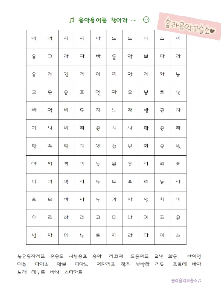 안녕하세요~ 솔라쌤이에요 ^^ 이제 봄날이에요 날씨도 좋고~ 음악하기 딱 좋은 날이에요 오늘은 음악생각하기 프로젝트를 해봅니다 생각하는 음악이론 시간을 만들어 보려고 합니다 그 동안 배운 내용들을 한 번 떠올려보는 시간입니다 음악용어를 찾으면서 무슨 뜻인지도 한 번 생각해보면 용어가 더 익숙해지겠죠~ 부모님이나 친구들과도 함께 해보면 좋은 시간이 될 것 같습니다 함께 아는 내용으로 대화 하는 시간이 너무 좋은 것 같아요 ^^ 방법 가로 세로 대각선 모두 가능해요 찾은 단어는 체크 V 하기 * 첨부파일 있습니다 * 다 찾으면 ~~ 이렇게 됩니다 즐거운 이론시간 되세요 ~~ #음악생각 #솔라쌤의음악교실 #솔라음악교습소 #음악용....... <img src="https://blogthumb.pstatic.net/MjAyNjAzMTdfOTIg/MDAxNzczNzMyNTUyNjgx.mdIWDu2FmJaWRzRVRDNNDDY9VWiB2hQSfEgvyfV7MfMg.AYHfFc63KuyB8iNIxchaQWU8I7C432bqLMFVP_QWEmIg.PNG/image.png?type=s3" />