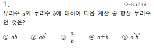 안녕하세요 오늘은 중3 1학기 제곱근과 실수에서 난이도 상 2문제를 풀겠습니다 실수 안에는 유리수와 무리수가 있는데요 유리수는 순환소수로 나타낼 수 있는 수를 말하고 무리수는 순환하지 않는 무안소로 나타내는 수를 말합니다 그렇다면 문제 속 보기에서 항상 무리수가 되는 것은 무엇일까요? 보기 2,5번은 무리수를 제곱해서 유리수로 만들 수 있기때문에 유리수가 되는 답입니다 그리고 보기 1,3번은 유리수 a를 0으로 가정하고 풀면 답은 0으로 유리수가 되겠죠? 그렇다면 남은 것은 4번이네요 유리수와 무리수의 합은 항상 무리수만 되니까 답은 4번입니다 n에 2015를 대입해볼게요 이니까 가 됩니다 이므로 일의 자리는 6이 됩니다 중....... <img src="https://blogthumb.pstatic.net/MjAyNjAzMTZfMTU0/MDAxNzczNjQxNzY1OTc5.LxyExtpLskc19pDUl8xAtFpuFWhUZ5ZeFy4IE-q-oZAg.YjIFX-xZ0omG8DTRkSZgD2v27rUrlLQv__iphKqpwFkg.PNG/%C1%DF3-1_%C1%A6%B0%F6%B1%D9%B0%FA_%BD%C7%BC%F6-%B9%AB%B8%AE%BC%F6%BF%CD_%C0%AF%B8%AE%BC%F6_%BB%F3_01.png?type=s3" />