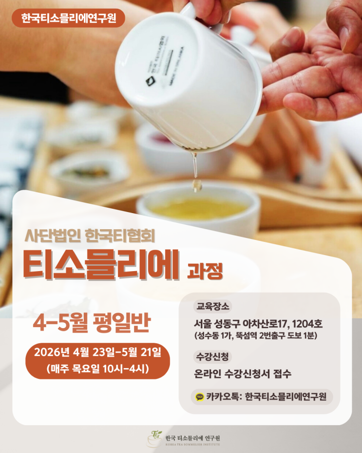 안녕하세요! 현업 식음료 종사자가 믿고 선택하는, No.1 티 전문 교육 연구기관 '한국티소믈리에연구원'입니다. 저희 한국티소믈리에연구원은 보다 전문적이고 체계적인 교육 서비스와 티 관련 도서 출판 등 다양한 콘텐츠를 통해 여러분들이 더 쉽고 재밌게 티의 세계로 한발짝 다가설 수 있도록 함께하고 있습니다. 봄을 맞이하기 위해 꽃샘추위가 불어오는 4월입니다 ️ 이 잠깐의 추위를 따뜻하게 녹여줄 TEA 한잔- 어떠신가요? 봄기운이 느껴질 때는 갓 수확한 맛있는 녹차를 마시면서 기분전환을 해보시는 것도 추천드립니다⭐ 맛있고 다양한 TEA를 마시고 배워볼 수 있는 가장 베이직한 과정! &qu....... <img src="https://blogthumb.pstatic.net/MjAyNjAzMDZfMzMg/MDAxNzcyNzc2MTAwNzE2.qKZU_oDeYHjZub59ZeJXFWMEMl0brM113IXRc3anKfYg.vxXlNoQr7r6jL7L9We2PA8ju6X7HZpiKM07jeN37gx4g.PNG/TS%C6%F2%C0%CF%B9%DD_1.png?type=s3" />
