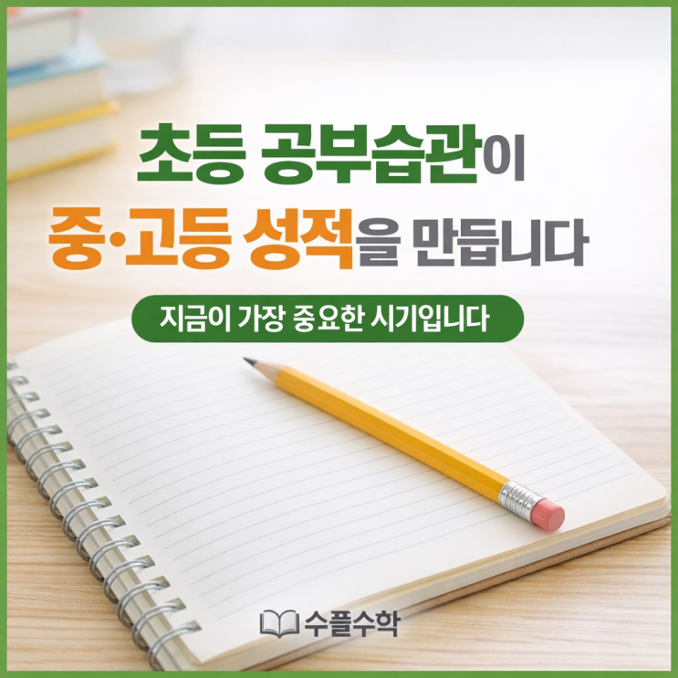 초등 때는 문제 난이도보다 공부하는 습관이 더 중요합니다. 지금 필요한 것은 문제를 많이 푸는 것이 아니라 바르게 공부하는 방법입니다. ✔ 집중해서 앉아있는 습관 ✔ 풀이를 쓰는 습관 ✔ 틀린 문제 복습 이 습관이 만들어진 아이들은 중학교에 올라가서도 흔들리지 않습니다. 수플수학은 문제를 많이 푸는 수업이 아니라 공부하는 방법과 태도를 만드는 수업입니다. ✔ 문제 읽는 방법 ✔ 풀이 정리 습관 ✔ 틀린 문제 복습 을 차근차근 지도합니다. 초등 때 잡은 공부습관은 평생 갑니다. 많은 학부모님들이 초등 수학에서 가장 걱정하는 것은 문제 난이도입니다. 하지만 실제로 중학교에서 어려움을 겪는 학생들을 보면 문제 난이도보다....... <img src="https://blogthumb.pstatic.net/MjAyNjAzMDlfMTcx/MDAxNzczMDM4NDc1Njg2.njenAxLrbO_-a9HtTL720YY7cd6bgWF6Bwb8QxXyw4Ag.6dmQVoLAJknbefYB3_k0Pf47bSteTwWHGdRBKGryWlYg.PNG/ChatGPT_Image_2026%B3%E2_3%BF%F9_9%C0%CF_%BF%C0%C8%C4_03_24_05.png?type=s3" />