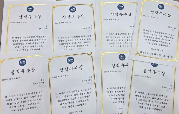 안녕하세요 학부모님들 :) 지난 주말 지샐 수학원에서 실시한 제 2회 지샐고사에 대해 소개해드리려합니다 제 2회 지샐고사 지샐고사는 각 학교별 기출문제와 난이도를 조정해서 중간고사 기말고사를 미리 대비하기 위해 실시한 ONLY 지샐표 시험입니다 각 학교별 작년 기출문제와 난이도를 조정해서 중간고사 기말고사를 미리 대비하기 위한 난이도로 설정하였습니다. 중학교 1학년~3학년, 고등학교 1학년 대상으로 시험이 치뤄졌고 고2, 고3은 시간 추후 공지예정이니 참고해주세요 시간배분 관리를 조절할 수 있고 OMR 카드 작성법을 익히는 시간이기도 합니다 "미리 준비한 학생만이 결과로 증명합니다" 우수학생 상장수여 & 성....... <img src="https://blogthumb.pstatic.net/MjAyNjAzMTFfODQg/MDAxNzczMjIxOTIyOTI4.fAVV6pw9eR5cIINE0tFuiRNUUkDWlnfbNfJ8dbirTc4g.fS7bRPrDH9c9bmGHFmKCOBnRf3W8Qq5XkjpbD1KFRMog.JPEG/KakaoTalk_20260311_160328695.jpg?type=s3" />