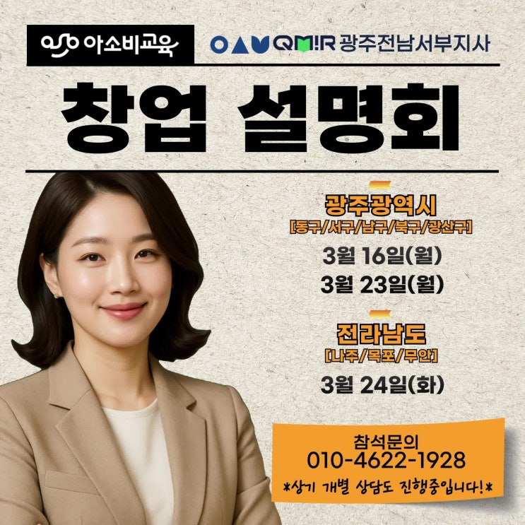 광주 아소비 공부방 창업, 정말 수입이 될까? 안녕하세요~~ 유치~초2 전문 교육 아소비 광주전남서부지사입니다. 예비 원장님들의 고민은 분명합니다. 공부방 창업, 정말 수입이 될까? 아이를 키우면서 병행 가능할까? 광주에서 이미 포화된 건 아닐까? 이번 3월 광주 아소비 창업설명회에서는 단순한 안내가 아닌 직접 확인할 수 있는시간입니다. 왜 지금, 왜 아소비 공부방 창업인가? 광주광역시는 대규모 신규 입주 아파트가 많아 학부모 수요가 꾸준하게 있습니다. 하지만 중요한 것은 지역이 아니라 ‘운영 구조’입니다. 3월 광주아소비 창업설명회에서는 겉으로 보이는 장점이 아니라 실제 운영 구조를 공개합니다. ✔ 초기 비용 구조 ✔....... <img src="https://phinf.pstatic.net/image.nmv/blog_2026_03_02_983/N1tcVQ4u6j_01.jpg?type=f480x480" />