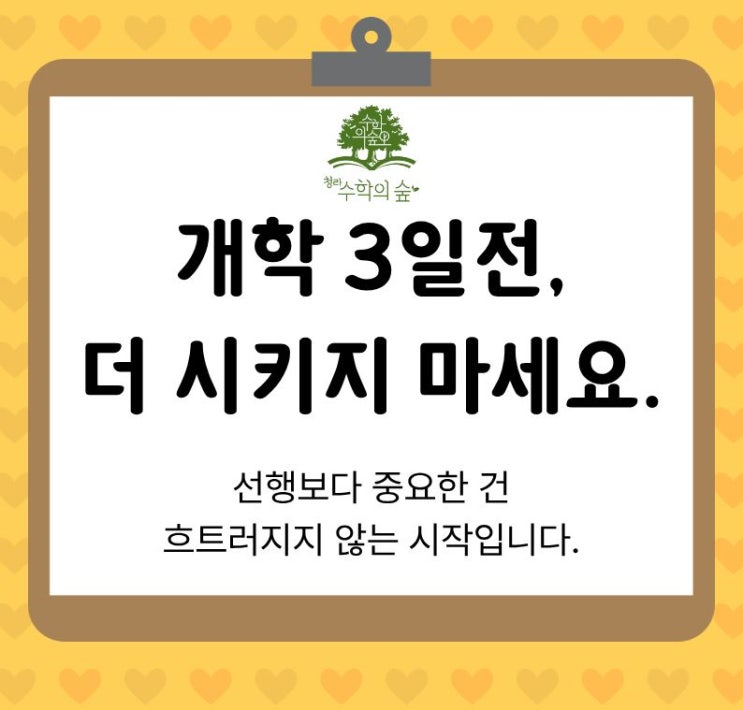 개학이 3일 남았습니다. 이 시기 학부모님들께 가장 많이 듣는 말이 있습니다. “선행을 더 해야 할까요?” “문제집을 한 권 더 풀려야 할까요?” 하지만 초중등 시기에는 더 많이 하는 것보다 안정적으로 시작하는 것이 훨씬 중요합니다. 개학 직전 3일은 실력을 올리는 시간이 아니라, 학기 초 흐름을 잡는 시간입니다. 1️⃣ 첫 단원, ‘가볍게’ 미리 보기 새 학기 첫 단원을 천천히 읽어보는 것만으로도 충분합니다. 새로운 용어가 낯설지 않게 만들기 어떤 내용을 배우는지 흐름만 파악하기 아이가 수업 시간에 “처음 듣는 느낌”이 아니라 “어, 이거 본 적 있어”라는 감각만 가져도 집중도는 크게 달라집니다. 선행의 목적은 속도가 아....... <img src="https://blogthumb.pstatic.net/MjAyNjAyMTNfMjU0/MDAxNzcwOTYzMDEyMjc0.bopRR3SR2gNOV6v3O7FsxjCZkk8KXv1WVZk49V80FRsg.UvZL4Nlmyf-ljwvA7uLBfqRkSS5rVaVXPYotRnCMHegg.JPEG/%C1%A6%B8%F1%C0%BB_%C0%D4%B7%C2%C7%D8%C1%D6%BC%BC%BF%E4._%2835%29.jpg?type=s3" />