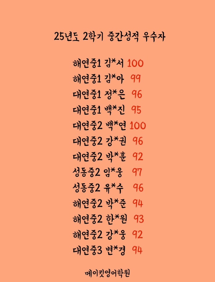 학원 확장과 중간고사 대비 기간이 겹쳐서 매우 바쁘고 정신 없었던 10월! 이 와중에 준비한대로 좋은 점수 받아온 메이킷 학생들!! 늘 하던대로 기말도 뿌수자!! #대연동영어학원 #대연동중등영어 #대연동고등영어 #대연동초등영어 #해연중시험 #대연중시험 #성동중시험 <img src="https://blogthumb.pstatic.net/MjAyNTExMjZfMTQy/MDAxNzY0MDkyNjA5MjY2.SzVVXSksYES-zrf2UYlJt8gGR-94gqnyObWYQj8sw4wg.PKydcZy-m2aAP19yrbOCTENOD0oDgazGdSisncbZIJ8g.JPEG/IMG%A3%DF7371.jpg?type=s3" />