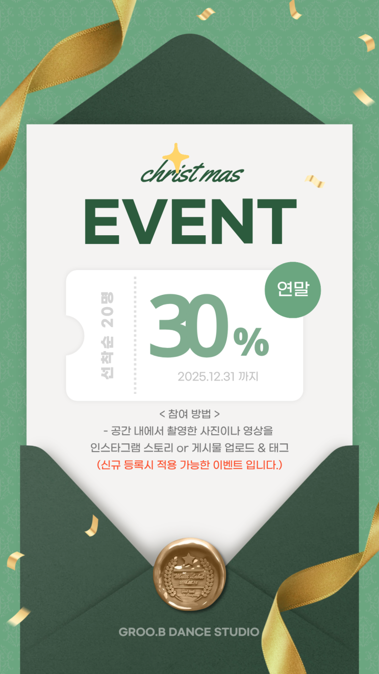연말이벤트 30% 그루비댄스스튜디오학원 안녕하세요 그루비댄스스튜디오학원 입니다 !! 잘지내셨나용?! 경성대 부경대역 5번출구에 위치한 #부산댄스전문학원 입니다 !! ♥ 그루비댄스스튜디오학원 상담문의 051-612-1058 010-5851-1259 ♥ 이번에 학원 리모델링을 간단히 하면서 연말도되었구 ! 연말이벤트 하나 나갑니당 ㅎㅎ 케이팝수업과 스트릿댄스 수업을 진행하고 있습니다 ! 케이팝은 요즘 유행하는 신곡들로 따끈따끈하게 진행중이랍니다 ! 지금은 케이팝 수업에서 올데이 프로젝트의 LOOK AT ME 안무를 배우고 있어요 요고 배우고 있어요 ㅎㅎ 사실 안무는 엄청 빡세긴하지만 기본기만 제대로 배운다면 다 해낼 수 있는 안무더라구요 !....... <img src="https://blogthumb.pstatic.net/MjAyNTEyMTlfMjMx/MDAxNzY2MTEwNTU3OTU2.pWwZeO0mO_mTVwUsbfbFnldbVTAvQgub2_Unlso78Igg.AjsReJp3vp2tu-4dja3RNUcysHZ9u-4tnsYdxYoHPNQg.PNG/�젣紐⑹쓣_�엯�젰�빐二쇱꽭�슂.png?type=s3" />