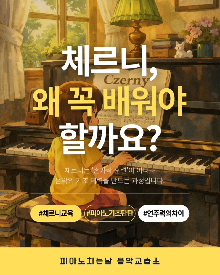 ❗️체르니는 왜 꼭 필요할까요? 학부모님들께서 자주 물어보십니다. "체르니 꼭 해야 하나요?" "아이들이 재미없어하지 않나요?" 사실 체르니는 아이들이 가장 좋아하는 교재는 아닙니다. ✅️ 하지만 가장 중요한 교재 중 하나입니다. 체르니는 단순히 손가락을 빠르게 움직이기 위한 연습곡이 아닙니다. ✔️ 손가락의 독립성 ✔️ 정확한 터치 감각 ✔️ 일정한 박자 유지 ✔️ 양손의 균형과 조절 이 모든 것이 체르니 안에 담겨 있습니다. 화려한 곡은 박수를 받습니다. 하지만 무너지지 않는 연주는 기초 위에서 완성됩니다. 체르니를 꾸준히 해낸 아이는 연주할 때 흔들리지 않습니다. 어려운 곡을 만나도....... <img src="https://blogthumb.pstatic.net/MjAyNjAyMjdfMjc5/MDAxNzcyMTk4NTY1NzI0.GvqnFdpUp1_072bw3gPlCCG_tIDrvfGGQFrbNxrdybIg.DRrH3AdD0YC_jFDvUT_B9JUEp0ENrkucEl3KiocXWX4g.JPEG/IMG%A3%DF5246.JPG?type=s3" />