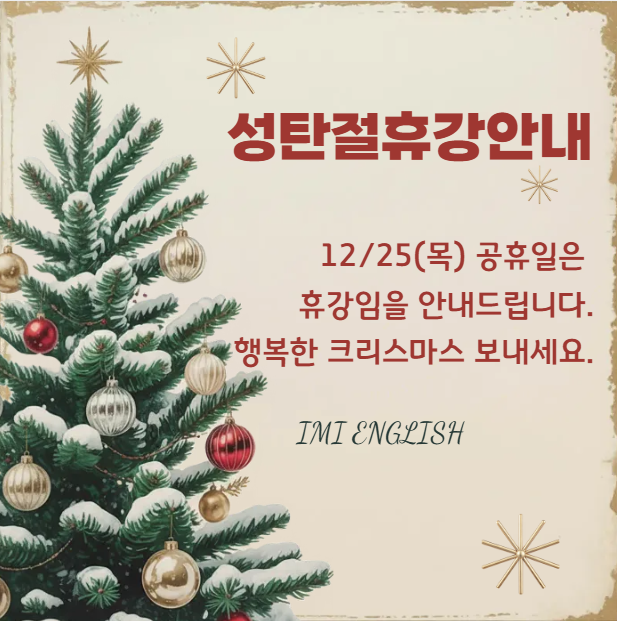 안녕하세요. IMI영어학원입니다. 12/25(목)은 공휴일로 휴강임을 안내드립니다. 따뜻하고 행복한 크리스마스 보내시길 바랍니다. 감사합니다. <img src="https://blogthumb.pstatic.net/MjAyNTEyMjBfNCAg/MDAxNzY2MjE0NTQwNTUw.J8PnqY3ZzYzs9UX--yo-pUrga5d92XPQtJOC18FX9NEg.lLDOmaysOYSvBgqJ0GZJehuFpzDntnVMEhN6zIpiai8g.PNG/image.png?type=s3" />