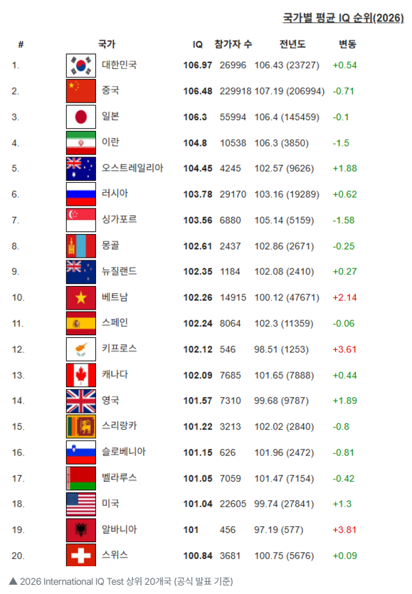 한국인의 평균 IQ(지능지수) 순위가 최초로 세계 1위를 차지했다. 국제 IQ 테스트(international-iq-test.com)가 지난 1월 발표한 2026년 국가별 평균 지능지수(IQ) 순위에 따르면, 2025년 한 해 동안 동일한 온라인 IQ 테스트를 치른 전 세계 수험자의 데이터를 기반으로 집계된 결과에서 대한민국의 평균 IQ는 106.97점을 기록하며 1위를 차지했다. 한국은 참가자 26,996명(전년 23,727명)으로 점수가 106.43 → 106.97 (+0.54) 상승하며 1위에 올랐다. 반면 중국은 대규모 참가자(229,918명)에도 불구하고 107.19 → 106.48 (-0.71) 하락해 2위로 밀렸다. 한국은 그동안 각종 국가별 평균 IQ 조사에서 매번 상위권을 유지했지만 1위를 차지한....... <img src="https://blogthumb.pstatic.net/MjAyNjAzMDRfMTE1/MDAxNzcyNjExNDU1NDUw.iFMcNdNlkeB6e4TWmd20B3wmZsYRWKYj_AKSuOhUsnMg.jcRl4Ax88YEpqnyTJCxB8m8u0gETqLsKwLh59CkvC3Ug.PNG/image.png?type=s3" />