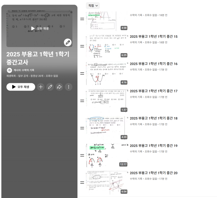 민락2지구에 위치한 수학 단과학원 '수학의기록' 입니다. [부용고 수학학원!] 영석고, 송현고, 송양고에 이어 부용고 [수학] 1학년 1학기 중간고사 문항들을 작업해 보았습니다. 전문항을 하나하나 개별녹화하고 업로드 하여 학생들이 원하는 문제만 쉽고 빠르게 언제든지 시청할 수 있도록 하였습니다. [생각보다 오래 걸리다보니 시험기간이 아닐 때 미리미리 작업하고 있습니다..] 기출문제 풀이는 수학의기록 재원생에게만 별도 링크로 제공하고 있습니다. 부용고등학교 2025년 1학년 1학기 중간고사는 객관식 19문제, 논술형1문제로 출제되었습니다 1번~12번 문항 교과서 문항중에서도 아주 쉬운 수준으로 출제되었습니다. 공부를....... <img src="https://blogthumb.pstatic.net/MjAyNjAzMTZfMjky/MDAxNzczNTk4MjgzOTMz.VKGktr5xLWzn1EVEzvoj-oZ1EGLwfCdeG0WBB0mtICsg.b9mcvk-L85_cwcFTWgJ-_wH2tFOo8kUA6aQbmJyIHVwg.PNG/image.png?type=s3" />