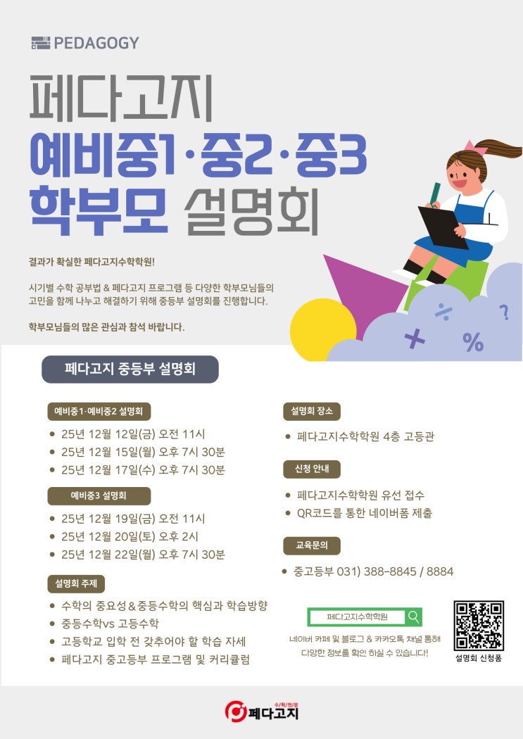 안녕하세요! 평촌학원가 중고등수학학원 페다고지수학학원 입니다. 2학기 기말고사가 끝나면 바로 겨울방학이 다가옵니다! 다가오는 겨울방학을 어떻게 보내야 할까? 학년이 올라가면 어떻게 공부해야 할까? 고민 많으실 우리 중등 학부모님들과 학생 여러분들을 위해 페다고지 중등부 12월 설명회를 진행합니다! 학부모님들의 많은 관심과 참석 부탁드립니다^_^ [예비중1 · 예비중2 설명회] - 12월 12일(금) 오전 11시 - 12월 15일(월) 오후 7시 30분 - 12월 17일(수) 오후 7시 30분 [예비중3 설명회] - 12월 19일(금) 오전 11시 - 12월 20일(토) 오후 2시 - 12월 22일(월) 오후 7시 30분 [설명회 주제] 수학의 중요성 & 중등수학의 핵심과....... <img src="https://blogthumb.pstatic.net/MjAyNTEyMTBfMjk4/MDAxNzY1MzQ3NDc4NzY0.FCoNNKOCeAeyITl-RGY_aJdEh52NRlOT01ntIYdWC5cg.rt6qNanOtP217nA16vpJIKHqHc4N0d3zactll1RkyHIg.JPEG/%B0%ED%B5%EE%B4%EB%BA%F1-%BC%B3%B8%ED%C8%B8-002.jpg?type=s3" />