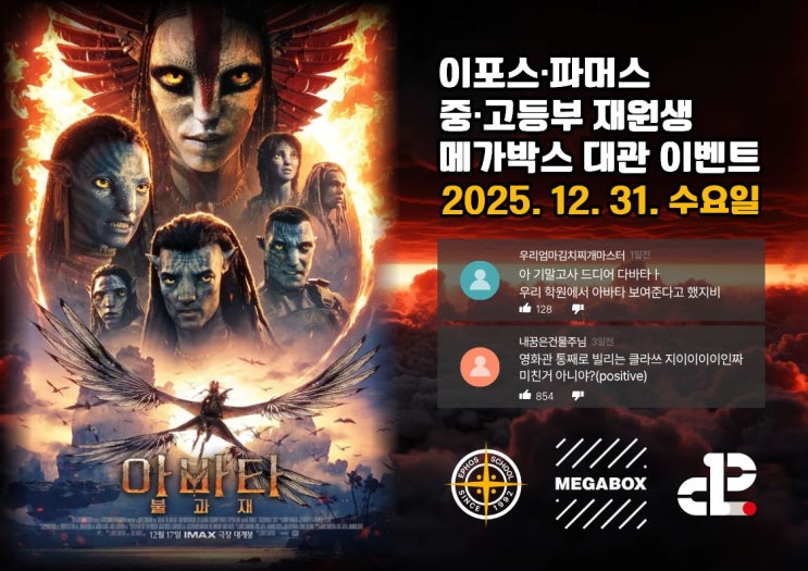 안녕하세요, 파머스국제어학원 별내브랜치입니다. 2025년의 마지막 날, 이포스학원 중고등학생들을 위한 특별한 선물을 준비했습니다. 시험을 위해 열심히 달려온 모든 학생들에게 힐링과 보상의 시간을 선물할 예정입니다! [메가박스 단독 대관 영화관람 이벤트] ●일자: 2025년 12월 31일 수요일 ●시간: 추후 상세 안내 예정 ●대상: 이포스 수학, 파머스 영어 중고등 재원생 ●장소: 별내 메가박스 ●영화: 아바타 [불과 재] ※ 각 학생의 참석 여부는 각 반에서 조사할 예정입니다. ✨ 학생 여러분, 수고 많았습니다:) 이포스학원과 함께 2025년을 멋지게 마무리하고 다가올 2026년을 힘차게 준비합시다! 감사합니다! <img src="https://blogthumb.pstatic.net/MjAyNTExMjZfODEg/MDAxNzY0MTQ2MzM5ODQ5.q82H0sQeYKW_K57pjSYjZlgrBcmvUtSmynwqfD8y3qMg.60GmqiabWmNkP14l4BJ7Az7G-PE7LKqI1wrEe6iU3Dcg.JPEG/%C1%A6%B8%F1%C0%BB_%C0%D4%B7%C2%C7%D8%C1%D6%BC%BC%BF%E4.jpg?type=s3" />