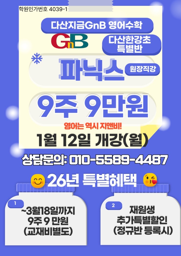 안녕하세요 다산지금지앤비영수학원입니다. 12월이 되자 벌써 26년을 준비하느라 바쁜 하루하루네요~ 모두들 올해 결실 잘 맺으시고 새해에는 기쁜일만 함께하시길 바라면서, 야심차게 준비한 겨울방학 특강안내할게요^^ 특별히, 이번에는 파닉스특강반에 재원생특별혜택이 있으니 관심있으시면 꼭 학원으로 연락주세요! 따스한 겨울방학을 기다리며.. 학원인스타: https://www.instagram.com/p/DR4DI3HEtUq/?igsh=ZXd0N3RwMGlpZ2I3 둘러보세요~~ <img src="https://blogthumb.pstatic.net/MjAyNTEyMDhfMTI4/MDAxNzY1MTc2NjU4ODcz.MJWpWv5CjaNYM5HdmF-ukP2pznlmlPqbBCmkYzkpXz0g.Vwm4pEuIAJIXn0RO6LaaUMPm2hLqklRy2cOBZYtD2pEg.JPEG/900%A3%DF%BE%D5%B8%E9.jpg?type=s3" />