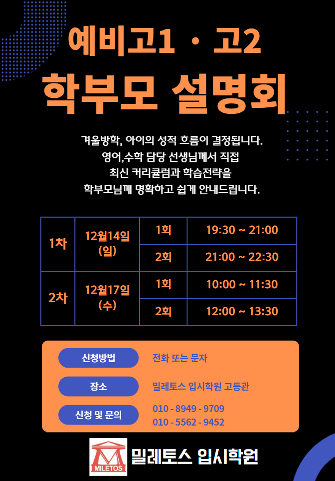2026학년도, 우리 아이의 시작을 함께 준비합니다 고등학교 진학을 앞두고 많은 학부모님들께서 요즘 하나같이 같은 고민을 전해오십니다. “고등 과정은 무엇이 다른가요?” “22개정 교육과정과 5등급제… 우리 아이에게 어떤 영향을 주나요?” “어떻게 시작해야 흔들리지 않고 갈 수 있을까요?” 특히 올해 예비고1과 예비고2는 그 어느 때보다도 ‘부모의 정보와 선택’이 아이의 성적을 좌우하는 해입니다. 밀레토스 입시학원은 이 변화의 지점에서 학부모님께 가장 정확하고 신뢰할 수 있는 방향을 안내드리고자 영어·수학 담당 선생님들이 직접 진행하는 학부모 설명회를 준비했습니다. 왜 이번 설명회가 중요한가요? 예비고1 ....... <img src="https://blogthumb.pstatic.net/MjAyNTEyMDhfMjcg/MDAxNzY1MjAzNjA4NzYw.TEeDnInmfbMgC06g-Ur9TYxl1EVgQC8CzUaFfgEHqvIg.vDm80TI_kazwfG56DwJUTZYniAdem9_bImbdG23DWY4g.PNG/%BC%B3%B8%ED%C8%B8_%C6%F7%BD%BA%C5%CD.png?type=s3" />