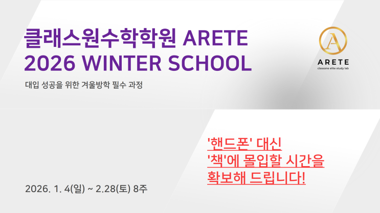 클래스원수학학원 ARETE 2026 WINTER SCHOOL 대입 성공을 위한 겨울방학 필수 과정 '핸드폰' 대신 '책'에 몰입할 시간을 확보해 드립니다! 2026. 1. 4(일) ~ 2.28(토) 8주 2026 윈터스쿨 개요 교육 기간 및 대상 기간: 2026.01.04(일) ~ 2026.02.28(토) 총 8주 과정 대상: 예비 고1~고3 (현 중3~고2) 양서고, 와부고, 동화고, 평내고, 판곡고, 호평고, 금곡고, 마석고, 심석고, 특목고, 자사고 등에 진학한 우리 지역 학생들 클래스원수학 특강 + ARETE 관리 학년별, 수준별 수학 예습 특강 수업 외 매일 5시간 이상 순공 시간 관리 국어, 영어 등 주요과목 내신 콘텐츠, 학습 가이드 제공 담임제, 일일테스트, 주간 학습 보....... <img src="https://blogthumb.pstatic.net/MjAyNTEyMDhfNTQg/MDAxNzY1MTkyODI2OTcw.Oz0irtbn852HufaFuhTQJxIPBX5z_aNgtLNI2yIakKsg.PTET4R78Jjls8dypLZ_0ddfciQ7LKqYt0px-WoxVuTEg.PNG/%BD%BD%B6%F3%C0%CC%B5%E51.PNG?type=s3" />
