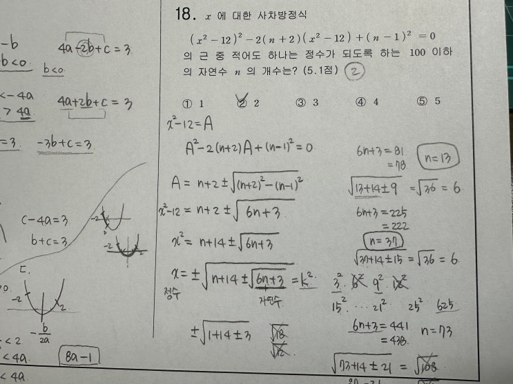 2026학년도 1학기 중간고사 시험대비 고등학교 1학년 1학기 중간고사 공통수학1 기출문제 기출문제 해설강의입니다. 서울특별시에 있는 경기고등학교 2025학년도 기출문제입니다. 2022개정교육과정입니다. 시험범위는 다항식, 방정식까지입니다. 난이도는 중상입니다. 살짝 어렵고 까다롭습니다. 문제를 읽고 이차방정식을 잘 세운뒤, 이차함수의 최댓값 최솟값을 구하고, 물어본 관람객 수를 구합니다. 내부의 점을 잘 찾고, (이때 x 좌표, y 좌표는 모두 정수입니다. ) 직선과의 교점을 잘 찾습니다. 사차방정식은 근이 네개가 있는데, 이 중에서 정수인 근을 갖는 n 을 찾는데, 조금이나마 쉽게 찾으려면 3의 배수중에서 짝수인지 홀수인지를....... <img src="https://blogthumb.pstatic.net/MjAyNTEyMTZfMjQ1/MDAxNzY1ODc3NDQyMjU5.LgGGgWQhNCXSyvvWVjRi2vcIHKFJnn9jP3upMFVmNc8g.s7by-6JVMrJ1suFRpkUyl46palwb3Yno6Ra07Tn6q1Qg.JPEG/IMG_2593.JPG?type=s3" />