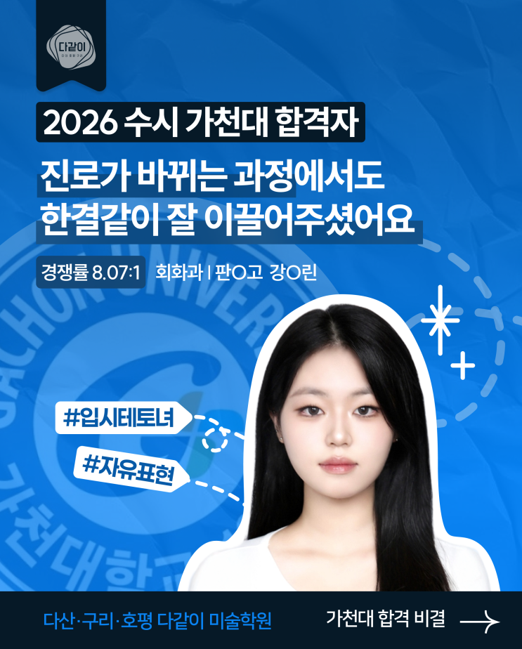 2026학년도 가천대학교 회화과 합격 인터뷰 디자인에서 회화로 진로가 바뀌는 과정에서도 다같이 미술학원의 한결같은 지도와 밀도있는 준비로 합격의 열쇠를 거머쥔 판O고 강O린 학생의 인터뷰를 소개합니다. Q1. 합격한 대학의 지원동기는 무엇이며, 어떻게 준비했나요? 처음 1년 정도는 디자인과를 목표로 준비하다가 고3이 되면서 기초디자인이 제 성향과 맞지 않는다는 걸 깨달았고, 상담 과정에서 홍쌤이 회화 쪽을 제안해주셔서 방향을 바꾸게 되었습니다. 준비는 빠르면서도 밀도 있게 했습니다. 추석 연휴 동안 혼자 세 번의 시험을 치며 실전 감각을 익히고, 평가, 보완, 재시험 과정을 반복하며 스타일을 잡아갔습니다. Q2. 실기를 준....... <img src="https://blogthumb.pstatic.net/MjAyNTEyMTdfMjQ1/MDAxNzY1OTYzMTM0NzY3._f47a881oddFtxmj-TIuWZ1DLi1XhO7ZRvqJGRJvM0Ug.Wq56y-9Cd_i8PwAMBYIefQW-RgS2KL190_R4swtSj9sg.PNG/5-0_%285%29.png?type=s3" />