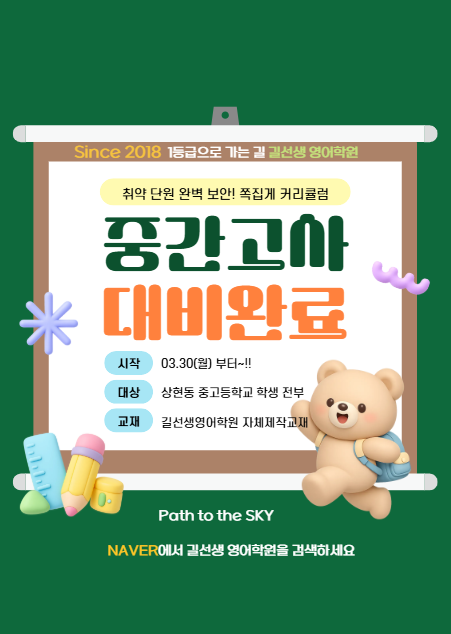 안녕하세요?^^ 우리 아이들 3월 신학기 적응하느라 다들 고생 많았지요? 새친구, 새담임선생님, 특히나 전학 온 친구들은 더 수고했다고 전해주고 싶네요~ 이래저래 어머님들도 총회까지 다녀오시느라 저마다 바쁘셨을 줄 압니다~ 한 숨 돌리려고 하는데? 중간고사 대비는 시작하시고 한 숨 돌리시기 바랍니다! 상현동 중, 고등학교 전문 영어학원인 길선생영어학원에서 3/30일 (월)부터 내신대비 시작합니다!! 우리 친구들이 죽어라죽어라 열심히 하는 문법부터 구문독해 및 서술형 대비 각 단원별 취약점 완벽 보완과 더불어 쪽집게 내신기출 최신문제까지~!!!! 2018년 부터 상현동 한자리에서만 쭉~~~ 다년간에 노하우로 우리 길둥이들은 확실....... <img src="https://blogthumb.pstatic.net/MjAyNjAzMjBfMzMg/MDAxNzczOTkwMDQwNTM0.P1Xz3C_9PWfb7JfcoQkKFrU4s6CF4AfSEY2cSL1fa3Eg.dCBISmH-xcdswRvGhKKfAH7uSSKzElZqSelFhpXcGMwg.PNG/KakaoTalk_20260319_213001279.png?type=s3" />