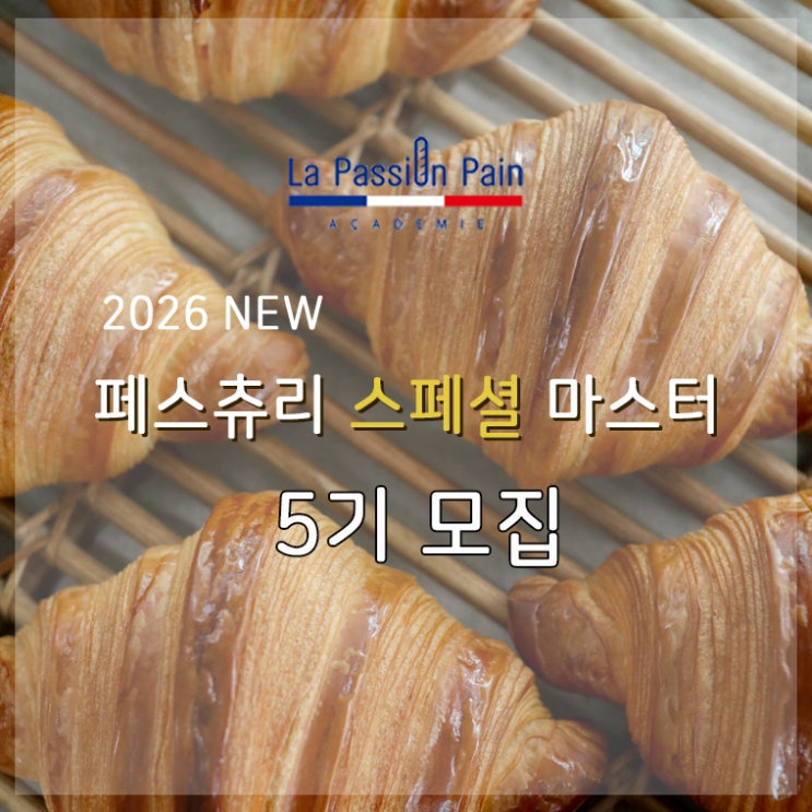 2026년 1월 <5기 모집> *메뉴 일부 변경 매 기수 조기 마감 정원 6명 개인 작업대(파리지엔) 파이롤러 2대 단기 페스츄리 교육의 정석, 정규과정 '페스츄리 스페셜 마스터' 요청과 문의에 힘입어 2026년에는 더욱 더 자주, 알찬 구성으로 만날 수 있도록 준비했습니다. 100% 실습 교육으로 이론과 실습을 가득 채웠습니다. 4일 단기 과정으로 제빵 페스츄리의 모든 것을 확인할 수 있습니다. 페스츄리 2주 단기 마스터 과정 "페스츄리 스페셜 마스터" 일정 및 필독사항 페스츄리 스페셜 마스터 5기 [교육 기간] 2026.01.15(목)~01.23(금) 1월 15,16, 22, 23일 (총 4일간) 목,금 10:00~16:00 (일일 5시간 / 점심 1시간....... <img src="https://blogthumb.pstatic.net/MjAyNTEyMDhfMTcy/MDAxNzY1MTYyNDE2NTg2.k7WOuz1hCf-4xfbBpSu0tCoyFKjUsBkieCWwBOtprcYg.rw7-sbjU09_-jJk88T0zmagMKpARGg6SSde4eTsQ4rAg.JPEG/%C6%E4%BD%BA%C3%F2%B8%AE%B8%F0%C1%FD_%BA%ED%B7%CE%B1%D7.jpg?type=s3" />