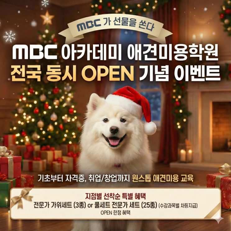 안녕하세요 연말이 들뜨는 이유는 힘들었던 한해를 훌훌 털어버리고 새로운 2026년에 대한 희망을 품기 때문이 아닐까 생각합니다 비젼있는 일 행복한 일 워라벨을 충족시키는 일을 하기위해 강북애견미용학원을 찾으시는 많은 분들이 비용과 시간때문에 고민하고 갈등하실거에요 MBC아카데미 강북애견미용학원에서 이 고민을 해결해 드리고자 자격증합격 책임제반 매일 1일1견 전문펫미용반을 운영하며 비용은 국비비용으로 교육의 질은 1:1전문가 과외처럼 거기다 취창업연계까지 지원합니다 또 특별한 혜택 MBC아카데미 전국 동시오픈 기념으로 미용도구 지급 이벤트를 진행합니다 고민하고 갈등하실 시간에 자격증을 취득하시고 갈팔질팡 학....... <img src="https://blogthumb.pstatic.net/MjAyNTEyMTdfMTU2/MDAxNzY1OTQzNzU3OTIx.X3GSnrVll0tCe5ZlWOeLyG15h8aHelB6Or6O-b9ZMGwg.Tw78VTNAXmFMmErSSbm0oTvM8kWt5aLuBdQwv7cdpxAg.PNG/KakaoTalk_20251217_123530412.png?type=s3" />