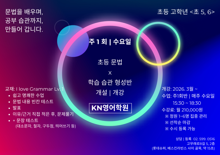 초등 문법을 배우며 공부 습관까지 초등 고학년 문법 · 학습습관 형성반 개설 초등학교 고학년이 되면 영어 학습에서 문장 구조, 즉 문법을 시작해야 하는 시기입니다. 문장을 어떻게 이해하는지, 왜 그렇게 해석되는지, 문장의 구조가 어떻게 이루어져 있는지를 이 시기에 처음 체계적으로 배우게 됩니다. 하지만 요즘은 수업을 듣고 과제를 해오는 것만으로는 실력 향상이 쉽지 않은 시대가 되었습니다. 수업을 듣는 것과 실력이 쌓이는 것 사이에는 분명한 차이가 있기 때문입니다. 배운 내용을 다시 떠올리고 생각하며 문제를 풀고 왜 그런지 설명하는 과정이 있어야 비로소 실력이 만들어집니다. 그래서 반포영어 KN English에서는 초등 고....... <img src="https://blogthumb.pstatic.net/MjAyNjAzMDlfMTA0/MDAxNzczMDQ0NTg1NDA1.4ns6-MuFK8WqrdOTnKYCC6i2x2C7alPvup11O4BW_rgg.NqUoLUcDtAoME1T7sGLHyMr6SpaSibSFCq23F8ZyBhEg.PNG/%C3%CA%B5%EE_%C1%D61%C8%B8_%B9%AE%B9%FD%B9%DD.png?type=s3" />