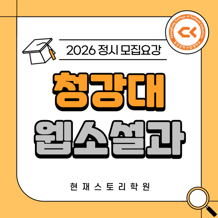 안녕하세요~! 문예창작, 극작, 영화, 웹소설과 입시전문 - 현재스토리학원입니다. 오늘은 2026 웹소설과 정시에 대비하기 위해서 청강대 정시 모집 요강에 대해 자세하게 알려드리려고 합니다! 청강대 웹소설과 2026 정시 모집요강! 올해부터 청강대 정시 실기 전형은 성적 반영 없이 실기 100%가 들어가게 됩니다! 그만큼 글쓰기 실력이 중요해지겠죠? 현재스토리학원에서는 모든 학생들이 웹소설과의 시제 유형에 맞추어 대학 입시 모의문제를 풀어보고 선생님께 첨삭을 받으며 입시 훈련에 매진하고 있습니다. 청강대 웹소설과 2026 정시 모집요강! 현재스토리학원에서는 웹소설과에 진학, 또는 편입하기 위해 고등학생, 재수험생, 편입생, 성....... <img src="https://blogthumb.pstatic.net/MjAyNTExMDRfMTQz/MDAxNzYyMjQ2MjkzODI4.xOtbFLLuHMvd8u0G6hgSN4qO5Efxpmgf-YQWGyUdWO4g.t-rxCpAiHUAjHF3Lua5hETWfIYmdV3CXJ7syneqrmQkg.PNG/2026%C1%A4%BD%C3%B8%F0%C1%FD%BF%E4%B0%AD_%286%29.png?type=s3" />