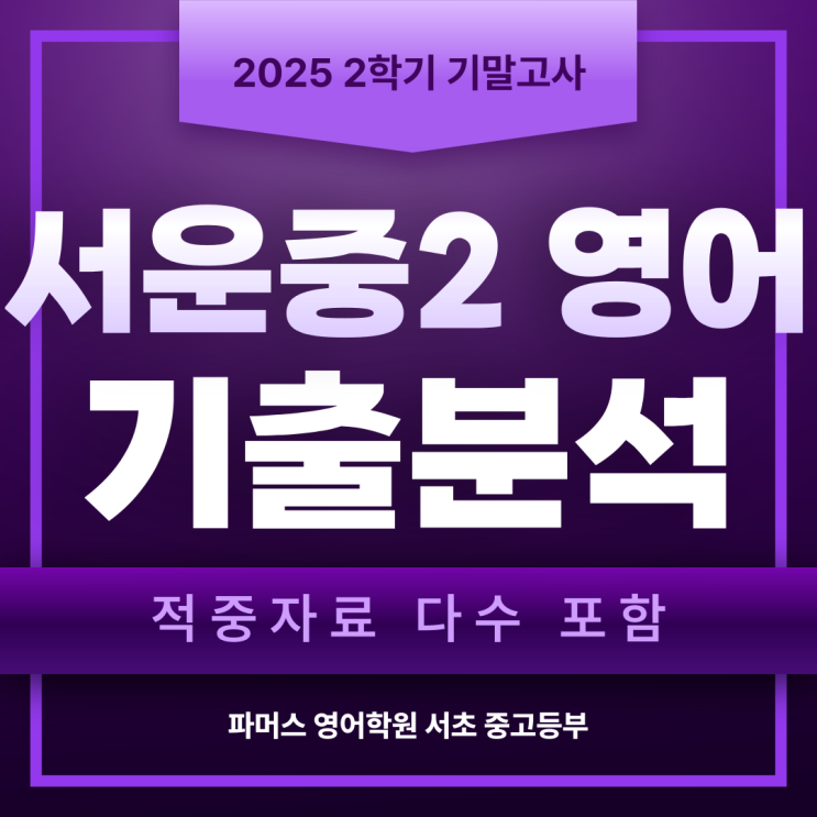 안녕하세요~ 파머스영어 서초 중고등부입니다! 시험 정보 이번 2025년도 기말고사는 7,8과 및 추가지문 4개로 평소와 비슷한 양이었습니다. 문제 영역별 배점 및 세부 교과서와 외부지문 출제 범위가 비슷하였으나, 교과서 내용이해 (32점) 부분이 많이 출제된 것이 특징이며, 반대로 외부지문에서 어(19점) 법을 가장 많이 출제하였습니다. 출제 범위별, 문제유형별 비율 (%) 강사 총평 by.Chloe T 이번 서운중2 시험은 꽤 까다로웠다. 토요특강 과 파이널시험에서 적중한 문제들이 매우 많지만, 그동안 고득점 했던 학생들도, ‘아는 문제이긴 한데, 답이 헷갈려서’ 놓쳤다는 문제들이 꽤 있다. 이번 토요특강에서도, 추가지문의 문법오류들을....... <img src="https://blogthumb.pstatic.net/MjAyNTEyMTRfMTY1/MDAxNzY1NzAxMDIxMTY3.0uU1Mrm9v-EhcXdaDOpy2x42fdrLk5X6xqUvlFEfGngg.kNdCADUWKbn_8qi-IjuYdvNpn779yYm2Ln1jMuZZ9DUg.PNG/%C1%A6%B8%F1%C0%BB-%C0%D4%B7%C2%C7%D8%C1%D6%BC%BC%BF%E4__%BA%B9%BB%E7%BA%BB-001.png?type=s3" />