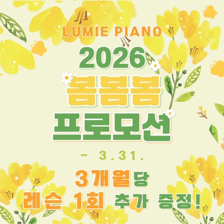 따뜻한 봄이 시작되는 요즘, 피아노를 시작하기에 딱 좋은 시즌입니다 그래서 루미에 피아노에서 봄맞이 특별 프로모션을 준비했습니다. 3개월마다 레슨 1회 추가 증정! 단순 할인이 아니라, 레슨 자체를 더 받을 수 있는 혜택이라 실력 향상에 훨씬 도움이 됩니다. 더 커진! 기간별 혜택 ✔ 3개월 등록 → 60만원 + 레슨 1회 추가 ✔ 6개월 등록 → 116만원 + 레슨 2회 추가 ✔ 12개월 등록 → 227만원 + 레슨 4회 추가 장기 등록할수록 혜택이 더 커지는 구조랍니다:) 이런 분들께 추천드려요 ✔ 이번 봄, 취미로 피아노 시작하고 싶은 분 ✔ 제대로 한 곡 완성해보고 싶은 분 ✔ 꾸준히 배우고 싶은 분 ✔ 레슨 효율을 높이고 싶은 분 루....... <img src="https://blogthumb.pstatic.net/MjAyNjAzMThfMzEg/MDAxNzczODEwMjM1MDcy.dksxnwVyauY0lHbl2kE5FJ50p8S1lPwlmLNeOvxQWs0g.8g6dsDYscVkpoghLLKC9CCCWfldRQVR6NZ-s9R-G3FUg.PNG/1773773108378.png?type=s3" />