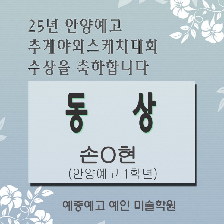 안녕하세요 강남 대치동 예중예고 예인미술학원 입니다 이제 겨울방학도 끝나고 새학기가 시작되었습니다 방학기간도 예인미술학원은 바빴답니다 바쁘다는 핑게로 차일피일 미루며 올리지 못했던 우리 학원 예중예고 합격생들의 좋은소식을 이제 하나씩 올려보고 있습니다 오늘은 안양예고 1학년 손o현 학생의 좋은 소식을 올려 볼께요 . . 지난 가을 안양예고에서 실시된 교내 추계야외스케치 대회에서 동상을 받았다는 기쁜 소식을 늦게 올려봅니다 안양예고를 합격하고나서 풍경화를 많이 해 보지는 못했는데 이렇게 좋은 결과를 얻게되어 너무 기쁨니다 올해 2학년이 되었고 전공은 중학교때 부터 하고싶었던 동양화를 선택했다고 합니다. 2학....... <img src="https://blogthumb.pstatic.net/MjAyNjAzMTJfMTA1/MDAxNzczMjkwNTk1MTA2.CuUwf2f2jXVQOXd6JfAmVrxJZdHtcE7cZdxcTZsuKiog.qhPrBUvnppw6-HnTk1vccdm0I-A-33u2Q2OSEdHrfecg.JPEG/25%BE%C8%BE%E7%BF%B9%B0%ED%BD%C7%B1%E2%B4%EB%C8%B8-%BC%D5O%C7%F6.jpg?type=s3" />