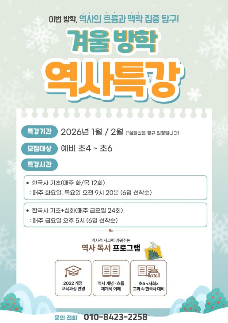 <겨울 특강 모집 안내> ●등록 방법: 아래 링크로 접수 해주세요^^ https://myip.kr/iJfCw 한국사 기초는 이렇게 진행해요:) 한국사 심화는 이렇게 진행해요:) 역사는 단순한 암기 과목이 아니에요~. 방학동안 역사의 흐름을 자연스럽게 이해하고 역사는 어렵다가 아닌 역사는 재미있다가 될 수 있도록 정성껏 지도하겠습니다:) <img src="https://blogthumb.pstatic.net/MjAyNTEyMTFfMjM1/MDAxNzY1NDE4MDEwMzU2.sGcLCe93An6GF_W_LdUKDm0iQvllUis6-XZAB_-_QPkg.jElQpTt8BIwhkRRw0m-i6lAGns853pjsKkY56DZzNSIg.JPEG/%C1%A6%B8%F1%C0%BB_%C0%D4%B7%C2%C7%D8%C1%D6%BC%BC%BF%E4..jpg?type=s3" />
