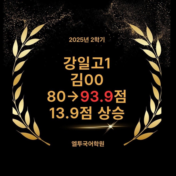 안녕하세요, 엘투국어학원입니다! 2025년 2학기 강일고 기말고사에서도 우리 학생들이 좋은 성과를 거두었는데요. 강일고등학교 1학년 학생들의 성적 향상 소식을 자랑스럽게 공유합니다! 개인 성적 향상 사례: 13.9점 상승! 노력의 결실을 맺은 자랑스러운 학생의 성적 향상 소식입니다. 학교/학년: 강일고 1학년 김OO 학생 성적 변화: 80점 → 93.9점 향상 점수: 무려 13.9점 상승! 단순한 암기가 아닌, 국어의 원리를 깊이 이해하며 학습했기에 단기간에 좋은 결과를 이룰 수 있었습니다. 강일고 1학년, 90점 이상 달성률 60%의 성과! 김OO 학생뿐만 아니라, 강일고 1학년 재원생 전체가 좋은 결과를 보여주었습니다. 이번 2학기 기말고사에서....... <img src="https://blogthumb.pstatic.net/MjAyNTEyMTFfMzAw/MDAxNzY1NDIyMDg2ODEz.b9mPUEWKva1gLadCgL1RjCPC5K2FZFmuGxOCjxeUPcUg.bPHCr1rN3aEb7jl2pDKIjkuu5s8PhqtMmeom0KdjFgAg.JPEG/2025_2%C7%D0%B1%E2_%B1%E2%B8%BB_%282%29.jpg?type=s3" />