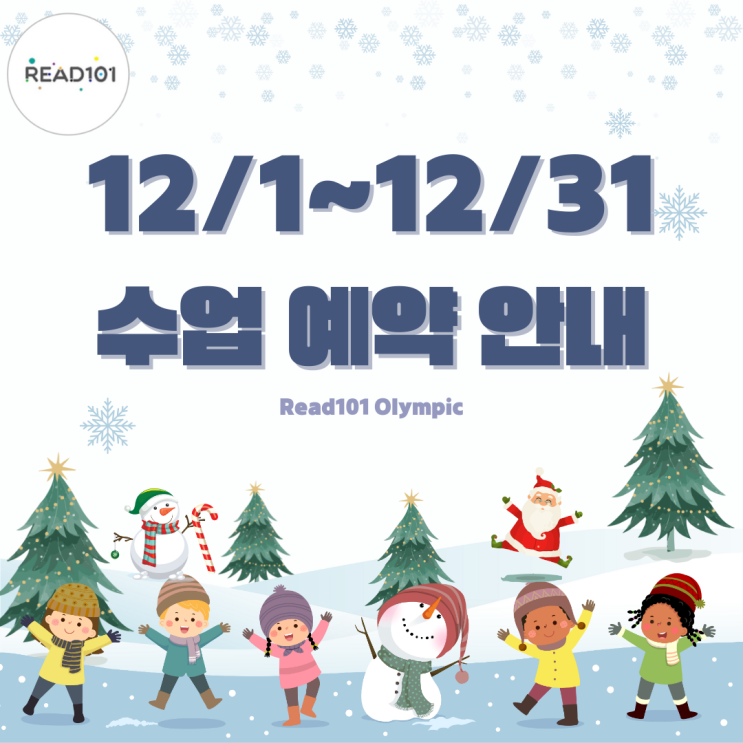 안녕하세요 리드101올림픽점 입니다. 12/1~12/31 예약제 수업시간이 아래와 같이 오픈 될 예정이오니 참고하시어 예약 부탁드립니다. 원활한 수업을 위해 고정예약은 불가능 하오니 학부모님들께서 양해부탁드립니다. 12/1~12/31 학기중 수업 예약안내 평일: 2시/ 3시/ 4시/ 5시/ 6시 토요일: 10시/ 11시/ 12시 ⏰ 평일: 13:30 ~ 20:00 -> 2시/ 3시/ 4시/ 5시/ 6시( 총 5타임 ) ⏰ 토요일: 9:30 ~ 14:00 -> 10시/ 11시/ 12시 (총 3타임) 매주 금요일 오후6시 일주일 단위 예약 OPEN! 12/1 ~ 12/6 예약은 11/28(금) 오후6시부터가능 --------------------------------------------------------------- 12/8 ~ 12/13 예약은 12/....... <img src="https://blogthumb.pstatic.net/MjAyNTExMjhfNzQg/MDAxNzY0MzE5NjgzMzE0.gVTqYWQbEQJseMBoA39PW0yg3piDyRQ5JPi0L7vA1mYg.ij1OIgKuumFBHJgFY9LWnB3hK7kqOXjCHQD4ijJVJpwg.PNG/Blue_and_Green_Creative_Christmas_Poster.png?type=s3" />