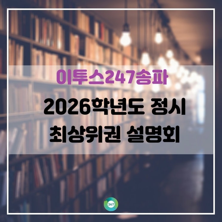 안녕하세요~ 이투스247송파 입니다! 정시를 지원하는 데에 있어서 수험생마다 다른 고민을 안고 있을 거예요 현재 자신의 위치가 어디인지에 따라 지원할 수 있는 대학의 범위도 달라지지요 이런 부분에 대해서 정확한 정보와 함께 유리한 전략을 세울 수 있어야 하는데요 오늘은 이투스247송파에서 2026학년도 최상위권 대학별 상세 설명회를 간단하게 안내해 드릴게요 해당 설명회의 경우 대치점이 확장하면서 이를 기념하여 진행되는 프로그램이에요 주요 내용 2026 수능 정시 주요 특징 및 핵심 포인트 최상위권 맞춤 대학별 지원 성공 전략 의약학계열/SKY 정시 지원 시뮬레이션 자신이 궁금했던 내용이 있다면 참석하여 정보를 얻을 수 있....... <img src="https://blogthumb.pstatic.net/MjAyNTEyMTVfMTM1/MDAxNzY1Nzk2NTM1NDY5.AgZVmEhyxNuQtbMXZmOtgKxUZQ0bksGC76c8vw7-nsQg.Vtzp2Yaanr9XsqD7h2hDp_Ppot-hbDetutMtNhQ84yIg.JPEG/1.jpg?type=s3" />