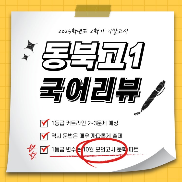 안녕하세요! 방이 고스 국어 김현중원장이에요. 동북고1학년 국어 시험지를 보고 깜짝 놀란게 직전 수업에서 공부한 내용이 많이 출제돼서 스스로도 놀랄 정도였어요. 이번 동북고1학년 2학기기말 국어 시험은 전략이 필요했어요. 왜냐하면 범위에 따라 난이도가 명확히 나뉘기 때문에 비문학<문학<문법 순으로 어려워지는 영역이어서 이런 경우는 절대적으로 비문학과 문학에 대한 100프로 정답률이 등수를 좌우해요. 실제로 문법이 1학기기말고사에 이어서 어렵게 출제될 가능성이 높더라도 실제 문법의 난이도가 매우 높아서 오히려 1등급을 판가름하는데 아주 큰 변수가 되지 않아요. (많은 학생이 틀릴 수 있는 문제는 틀려도 1등급에....... <img src="https://blogthumb.pstatic.net/MjAyNTEyMTVfNjkg/MDAxNzY1Nzg0OTQzNDMy.T4MsMfDyra9X9fR-dDVe6HnpxQza8o7Uzq19jRLWFH8g.mP9O0btjXQu310jzoSw5jsQM2oCmUUwjlEOiyBsWcjIg.JPEG/001.jpg?type=s3" />