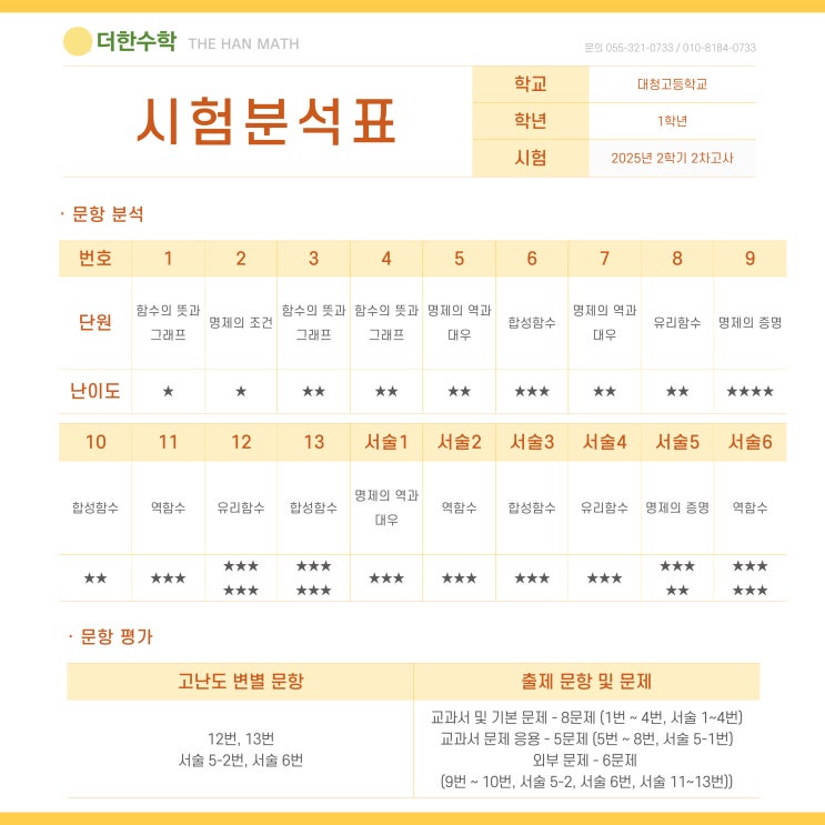 김해 대청고등학교 2025년 2학기 2차고사 수학시험 분석표입니다. 모두 전체적인 난이도가 어렵게 출제되었고, 2학년의 경우 문항 오류로 다음날 재시를 실시하여 점수가 최종 반영되는 작은 이슈도 있었습니다. 우리 더한선생님들이 바라본 대청고 시험은 어땠는지 천천히 읽어보시고 도움이 되셨으면 합니다. 더한수학학원은 소수의 학교들을 중심으로 수업을 운영합니다. 각각 학교의 출제경향을 정확히 파악하고 맞춤 학습을 진행하여 학생들이 최선의 내신 점수를 받을 수 있도록 노력합니다. 더한수학학원이 더 궁금하시다면 언제든지 편하게 문의주세요. 감사합니다! <img src="https://blogthumb.pstatic.net/MjAyNjAxMjdfMzgg/MDAxNzY5NDg2MDg5Nzg1.l7txGX03z7jmJlbZnSyWr8SBBy61MFRUnyXQTF6zkTog.yw_VPSBpRkna1ZkQYqjFHSqiy-Sc1VsOgkfHAUV2-isg.JPEG/013.jpg?type=s3" />