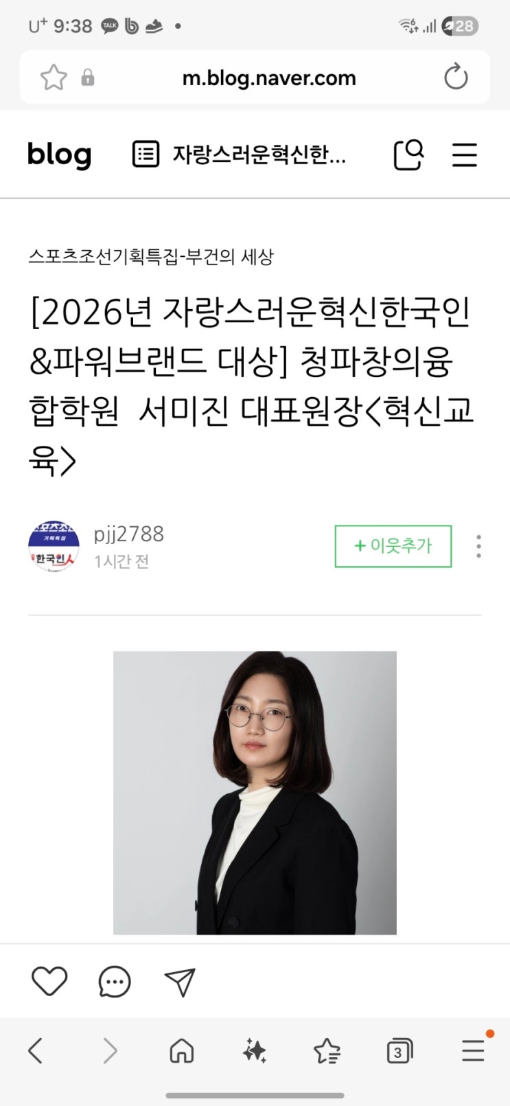 조선일보사와 월간한국인 주최 2026년 상반기 혁신 한국인 대상을 수상하게 되었습니다, 학부모님들과 학생들이 모두 같이 일궈낸성과입니다 올 한해도 좋은과정 좋은 결과로 보답하겠습니다. 안녕하세요, 청파창의융합 입니다. 김해 학부모님들의 꾸준한 성원 덕분에 기쁜 소식을 전하게 되었습니다. 본원의 원장님께서 탁월한 교육 철학과 혁신적인 지도력을 인정받아, [2026 자랑스런 혁신한국인 & 파워브랜드 대상] 교육 부문 대상에 선정되셨습니다! "왜 우리 아이는 (청파)에 다녀야 할까?" 수많은 학원이 있지만, 언론이 주목한 교육 전문가는 흔치 않습니다. 버사 원장님만의 특별한 '밀착 케어'와 '성....... <img src="https://blogthumb.pstatic.net/MjAyNjAyMjdfMjE0/MDAxNzcyMTUzNzMxNzM4.1wchwUQKxuaD9y0sIMTv2oI9GTuu_NS3EN_G3kicn4Qg.HH0IZVIDTVFIkktihTmMnlBWXBEfjxqOBUulozIhHAsg.JPEG/900%A3%DFScreenshot%A3%DF20260227%A3%DF093838%A3%DFSamsung_Internet.jpg?type=s3" />