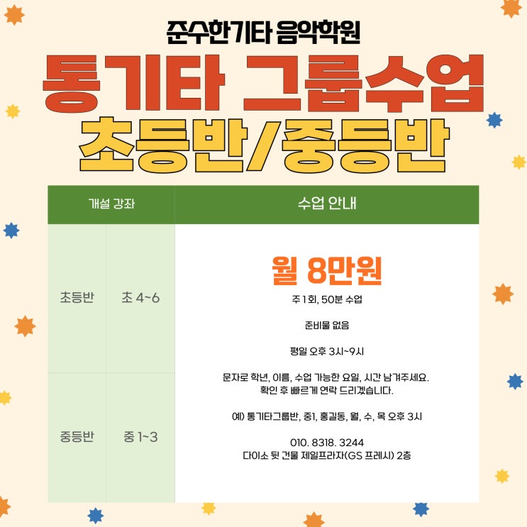 안녕하세요. 준수한기타 음악학원입니다. 겨울 방학을 맞이하여 학생을 대상으로 통기타 그룹수업을 진행하려합니다! -수업은 원장 직강입니다. 책임감을 다해 즐겁게 수업하겠습니다. https://blog.naver.com/js_guitar5/223124218538 -초등반, 중등반, 고등반 모집하고 있습니다. -악기가 없어도 가능합니다. 학원에서 대여해드립니다. -12월 한달 동안 모집하고 1월부터 진행하는 그룹수업입니다. -평일 오후 1시~5시, 주 1회 50분 그룹수업이고 최대인원은 6명입니다. -수강신청시 이름/학년/가능한 요일, 시간대를 카페 메시지 또는 01083183244로 연락주시면 감사하겠습니다. -수업 기간 동안 따뜻한 음료, 시원한 음료, 간식 제공합니다. ....... <img src="https://blogthumb.pstatic.net/MjAyNjAyMjhfMjI1/MDAxNzcyMjQ5Mzg4NDMx.TMbSaMrnj_M6tpOXeNbxhO6q05c1KFmpXxVtbX60AhIg.po4A1B8l4aRMja7aQaLl35nrN_XcKscccQK-ldKrUwYg.JPEG/%C5%EB%B1%E2%C5%B8_%B1%D7%B7%EC%BC%F6%BE%F7_%C3%CA%B5%EE%B9%DD_%C1%DF%B5%E7%B9%DD.jpg?type=s3" />