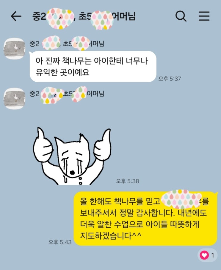 아이들이 성장하는 모습을 보는 것만으로도 너무나도 행복한데 가끔 개인톡으로 응원해주시는 부모님들엔 정말이지 몸둘 바를 모르겠다ㅠㅠ 그저 더 따뜻하게 더 세심히 아이들을 지도해야겠다고. 다시 한번 다짐하고 오늘도 힘 내본다 #책나무독서논술 #반곡동책나무 <img src="https://blogthumb.pstatic.net/MjAyNjAyMTNfMTAx/MDAxNzcwOTkxMzk2NDI0.6JxSw2M1yQFj99gq61K1nq6MuMACNKnQEwDsDbSsiIQg.4KUtZZZ2jMsozvV1OODHybuExIIpgU4ISXWfuIqVtb8g.JPEG/900%A3%DFScreenshot%A3%DF20260213%A3%DF221849%A3%DFKakaoTalk.jpg?type=s3" />