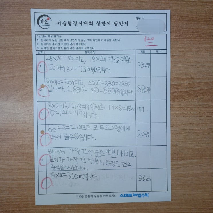 "다정동 가온수학학원 학생들의 노력이 담긴 서술형 시험지 공개!"