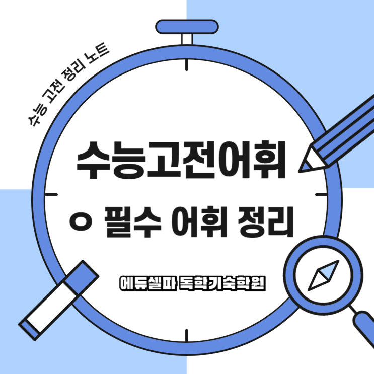 안녕하세요. 에듀셀파 독학기숙학원 하린쌤입니다. 지난 <ㅅ> 시리즈 복습은 잘 진행하고 계신가요? ‘삼경’, ‘수간모옥’처럼 처음에는 낯설던 단어들도 이제는 지문에서 만나면 자연스럽게 의미가 떠오르기 시작했을 겁니다. 고전은 반복입니다. 낯섦이 익숙함으로 바뀌는 순간, 독해 속도는 달라집니다. 오늘은 수능고전문학어휘 <ㅇ> 시리즈를 정리해 보겠습니다. 이번 단어들은 특히 “상징”과 직결되는 어휘가 많습니다. 즉, 뜻만 아는 것으로는 부족합니다. 작품의 정서와 연결해야 합니다. 암향(暗香) : 매화 향기 그윽하게 풍겨오는 향기라는 뜻으로, 고전 문학에서는 십중팔구 매화의 향기를 의미합니다. 매화는 선비의....... <img src="https://blogthumb.pstatic.net/MjAyNjAyMjdfMTMz/MDAxNzcyMTk3ODY0Nzk0.kObZ_sp-xM8zQs-NMhXKLb0_q9wNEeVs6IFFJ2sVdrMg.rhH9jLV0ABIs-K8eqK4991rb-WtadkskVgN9uyH12gog.PNG/%BC%F6%B4%C9%C6%AF%B0%AD__%BA%B9%BB%E7%BA%BB-001_%2855%29.png?type=s3" />