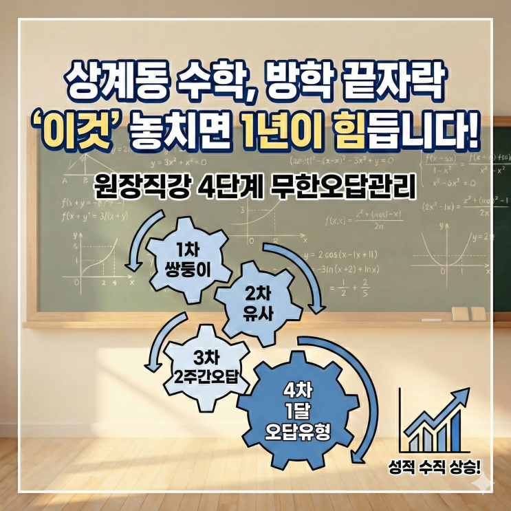 안녕하세요. 상계동 상계주공1단지 수학학원 최상위쌤입니다. 개학이 코 앞으로 다가온 지금, 달력을 보시며 걱정이신 학부모님 많으시죠? "방학동안 예습은 커녕 지난 학기 복습도 제대로 못했는데 어쩌지?" 이런 불안감, 요즘 저희 수학학원에 상담하러 오시는 학부모님들이 지금 이 고민을 많이 얘기주셔서 누구보다 잘 알아요. 하지만 너무 걱정하지 마세요. "수학의 학습방향"만 정확하다면, 우리 아이 수학 자신감은 확실히 바꿀 수 있습니다. 선생님, 인강도 보고 학원도 다녔는데 왜 점수는 그대로일까요? 며칠 전, 저희 학원에 상담 오신 중등 아이 어머님의 첫마디였습니다. 상계동 수학학원도 다니고, 중계동 수....... <img src="https://blogthumb.pstatic.net/MjAyNjAyMTZfMjIw/MDAxNzcxMjE4MzQ3NDcx.TIDjZkAXe00GCUcJwCMnh0Zr-LzeiKFkSe-btenTYwIg.HB_qtbIfO99hkCXRbCWXAQU3BkBSs2XEGmjngCLabdkg.PNG/Gemini_Generated_Image_sud4yusud4yusud4.png?type=s3" />