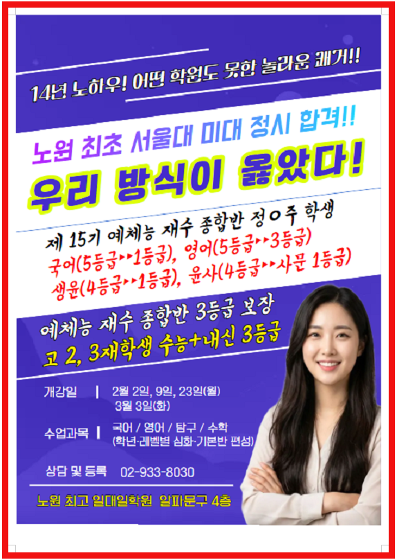 안녕하세요? 노원 최초 예체능 수능 전문 일대일학원입니다. 오늘은 반가운 소식을 공유 하려합니다. <img src="https://blogthumb.pstatic.net/MjAyNjAyMTlfMTYz/MDAxNzcxNDk1NTcxNDY1.GlM8hETqBNmPtWcvMUN-DiSOvE5haJinj321zSddZVMg.nWFqsN-t_-Gg2LMP7uM4v-ZiXYDRzwoykfAY4cW8dmUg.PNG/%C7%D5%B0%DD1.png?type=s3" />