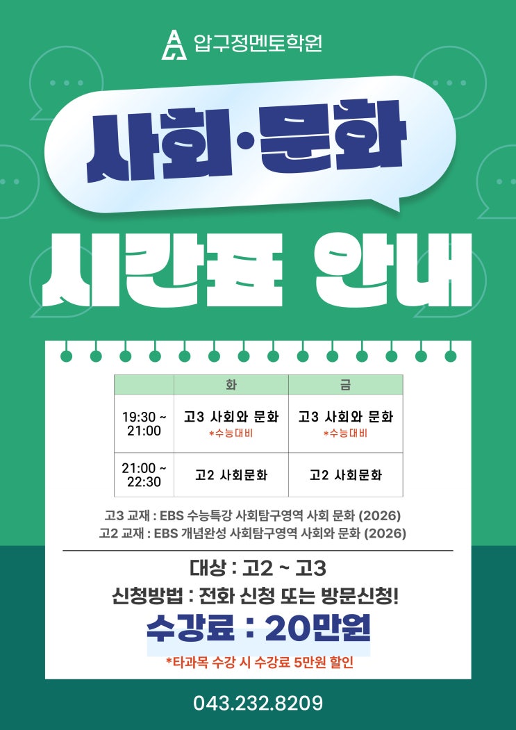 [청주압구정멘토학원] 고3 사회와문화, 고2 사회문화 시간표 안내(수업 개설)