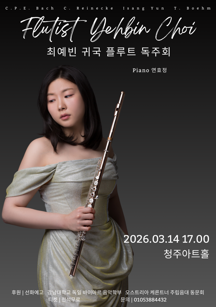 안녕하세요! 베를린 음악학원입니다. 오늘은 저희 원에 출강하고 계시는 플루트 최예빈 선생님의 독주회 소식을 전합니다. 최예빈 선생님은 선화예고를 졸업하셨고 오스트리아에서 석사 유학을 마치고 작년 2월에 귀국하셨어요. 귀국 하시자마자 모셔와서 3월부터 저희 원에서 수업을 하신답니다. 가까운 청주에서 독주회를 하니 관심있으신 부모님들의 많은 참여를 부탁드려요. 플루트 수업도 전문강사에게! 베를린 음악학원으로 문의주세요^^ <img src="https://blogthumb.pstatic.net/MjAyNjAyMTNfMjcw/MDAxNzcwOTU1ODI1NzQz.gRTJGCpgmlEaDBkT12zkPZA8zrr6B0Z2ryGVMVkdKpgg.xmx4IZ5ktWp-0YrZEaFaxJ_47WDK4kMJz9tZVWiAU3wg.PNG/%B5%B6%C1%D6%C8%B8.png?type=s3" />