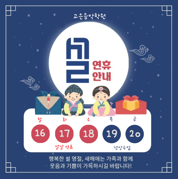 설 연휴 16일~18일 휴원 19일 부터 정상수업 진행합니다. 행복하고 즐거운 명절 연휴 보내세요~ <img src="https://blogthumb.pstatic.net/MjAyNjAyMTNfODAg/MDAxNzcwOTU0NDcyNTg1.z9wWQaiO394iCdOGMB9QWmqOzdahoxV-A85-I9QMXkcg.aVOs-pM7Fj0qb0ocV7_iDlTj5rEZUK9fY1AnacV4mQIg.JPEG/%BC%B3%BF%AC%C8%DE.jpg?type=s3" />