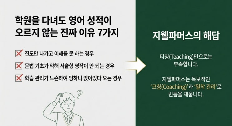 중학교 입학 후 첫 시험 90점대가 즐비한 반에서 70점도 안 되는 성적표를 받아든 우리 아이 "엄마... 나만 못하는 것 같아, 다들 다 아는데 나만 몰라" 이때는 이미 늦습니다. 아이의 자신감은 한순간에 무너지고, 한 번 뒤처진 격차는 좀처럼 좁혀지지 않습니다. 지난 20년간 수천 명의 학생을 지도하며 봤습니다. 중학교 가서 고생하는 아이들의 공통점은 초등 때 제대로 안 잡아놔서 그렇습니다. 중학교에서 무너지는 아이들의 공통점은 한결 같습니다. ❌ "영어가 재미있어야 한다" 는 말만 믿고 놀이식 수업만 한 아이 ❌ "초등 때는 학원 안 보내도 된다" 며 엄마가 방치한 아이 ❌ "중학교 가서 하면....... <img src="https://blogthumb.pstatic.net/MjAyNjAyMTRfMTkx/MDAxNzcxMDM0NTkyMjY2.YGwgUUoTp4gS1n8pOCNVWh3dDWcy7Up6JjNtTQoZxp8g.dbRPgWMMO3OttiZlSFifHFbarV0IMEA31Eh7RG1IROEg.PNG/%BE%F6%B8%B6_%B3%AA%B8%B8_%B8%F0%B8%A3%B4%C2%B0%CD_%B0%B0%BE%C6.png?type=s3" />