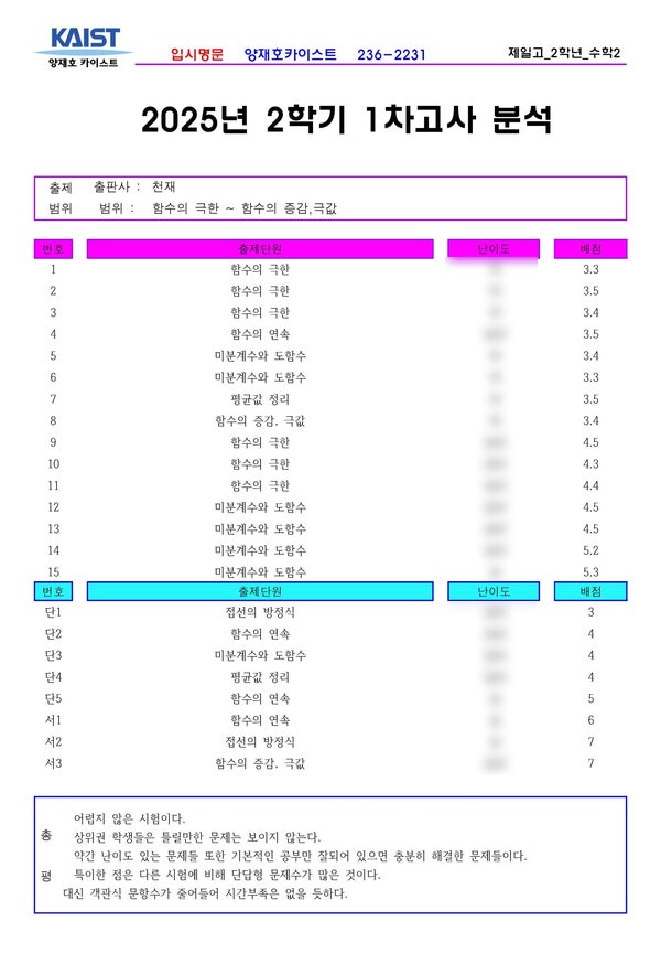 제일고 2학년 2학기 1차고사 수학2분석 전주 중★고등수학 상위권의 표본인 전주 수학학원 양재호카이스트학원입니다. 이번에는 전주 제일고 2학년의 수학2, 2025년 2학기 1차고사를 분석하여 보겠습니다. 위의 내용 중 난이도는 양재호카이스트학원의 내부자료입니다. 그런 이유로 블로그에서는 모두 공개할 수 없음을 양해바랍니다. 학원에 내원하시면 열람가능합니다. ^^ 중화산동 수학학원 양재호카이스트학원에서는 전주에 있는 중★고등학교의 기출을 항상 분석하고 기록으로 남기고 있습니다. 아직 시험을 보지 않은 학생들에게는 좋은 자료가 되고 또한 내년, 내후년에 후배들에게 많은 도움이 되기도 해서입니다. 그리고 시험직전에 시....... <img src="https://blogthumb.pstatic.net/MjAyNTExMzBfMTE5/MDAxNzY0NDg0NjI2MjMz.XMIU2lva21H8bRku40taoloPAttcexAIYDk1zqYc-YEg.F4ivfE-f3zCqwA-LvsC1SLTGs6MGk7P2LUhWOEgLzYUg.JPEG/2025_2%C7%D0%B1%E21%C2%F7%B0%ED%BB%E7_%C1%A6%C0%CF%B0%ED2_%BC%F62.jpg?type=s3" />
