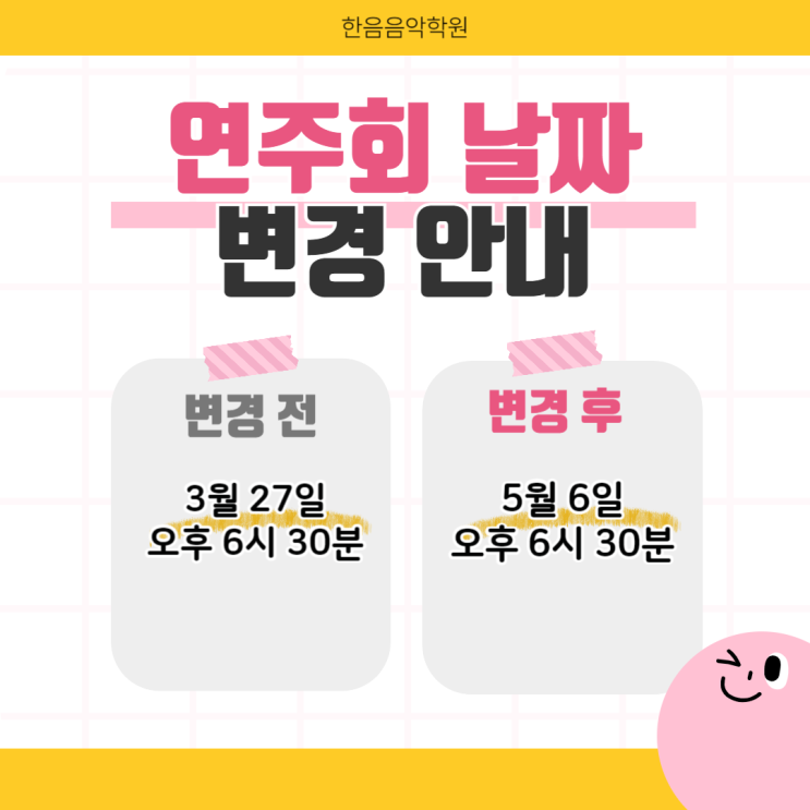 안녕하세요 한음음악학원입니다! 2026년 3월 27일로 예정되어 있었던 꿈키움아트페스티벌 연주회가 5월 6일로 변경되었습니다! 연습 과정에서 아이들의 열정이 예상보다 뜨거워, 곡의 완성도를 한단계 더 높여 더 큰 성취감을 갖게 해주고자 연주회 날짜를 5월 6일로 조정하게 되었습니다. 가족과 함께하는 따뜻한 시기에 우리 아이들이 선사하는 최고의 선물! 기대해주세요 ^^ 기다려주시는 시간만큼 더 진한 감동이 있는 연주회로 보답하겠습니다. 감사합니다! 신월동음악학원 신월동음악 신월동피아노 신월동피아노학원 신월동바이올린 신월동바이올린레슨 신월동바이올린렛슨 신월동바이올린학원 신월동첼로 신월동첼로레슨 신월동첼로렛슨 신....... <img src="https://blogthumb.pstatic.net/MjAyNjAzMTNfMjIx/MDAxNzczMzkxNDI4NTk1.8xcJAEZiX7IAHNjC0DQjAox9trPwr1mPcgB81yFON70g.NmYoEcyVOxtVXbAmBg4qvnAopB8O_PY28a6SpwDh2jog.PNG/%C1%A6%B8%F1%C0%BB_%C0%D4%B7%C2%C7%D8%C1%D6%BC%BC%BF%E4_-001.png?type=s3" />